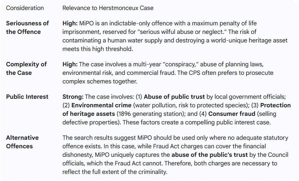 Alternative Offences: The search results suggest MiPO should be used only where no adequate statutory offence exists. In this case, while Fraud Act charges can cover the financial dishonesty, MiPO uniquely captures the abuse of the public's trust by the Council officials, which the Fraud Act cannot. Therefore, both charges are necessary to reflect the full extent of the criminality.